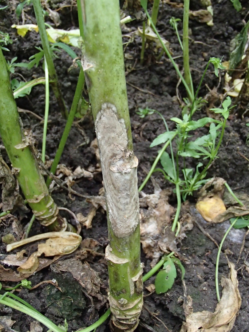 Slimības pazīmes - auga augšējā daļā uz galvenajiem un sānu dzinumiem redzami sausi plankumi - bālgani ārējās malās, pelēcīgi centrālajā daļā, uz kuriem mitros laika apstākļos attīstās balta sēņotne. Plankumu attīstība sākas vietās, kur piestiprināts lapas kāts vai atiet sānzars, vēlāk tie izplatās abos virzienos. Virs inficētās vietas augi sakalst un dzeltē, kamēr veselie augi vēl ir zaļi. Stiebra iekšpusē veidojas apmēram 5 mm gari melni sklerociji, kuri ražas novākšanas laikā nonāk augsnē un nākamajās vasarās veido sporas. Slimības bojātais stiebrs viegli lūst. Saveldrētos sējumos inficētie augi labi redzami, jo stāv taisni. Pazīmes rapsim novērojamas pēc ziedēšanas, vislabāk tās ir novērojamas nogatavošanās periodā.