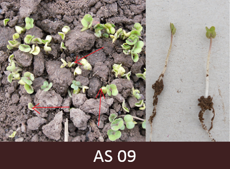 09 – Dīgļlapu parādīšanās virs augsnes. Dīgļlapas redzamas virs augsnes virskārtas, veidojot „āķi”, bet vēl nav pilnībā atvērušās.